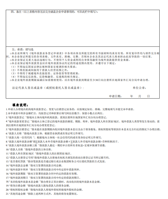 (一)书面申请,内容包括境外放款资金使用计划和还款计划、放款人和借款人经营情况、存量境外放款情况,承诺无重大违法违规行为以及资金来源、用途合规且不超出放款协议约定的用途范围等,并附《境外放款业务登记申请表》。