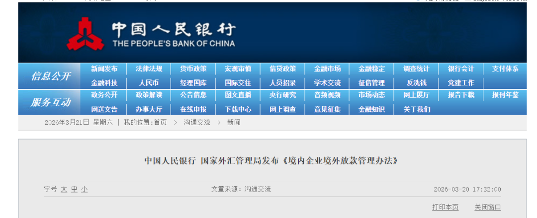 3月20日,中国人民银行、国家外汇管理局联合发布《关于印发〈境内企业境外放款管理办法〉的通知》,并同步就政策出台背景、主要内容、额度安排、登记审核标准及存量业务衔接等问题答记者问。
